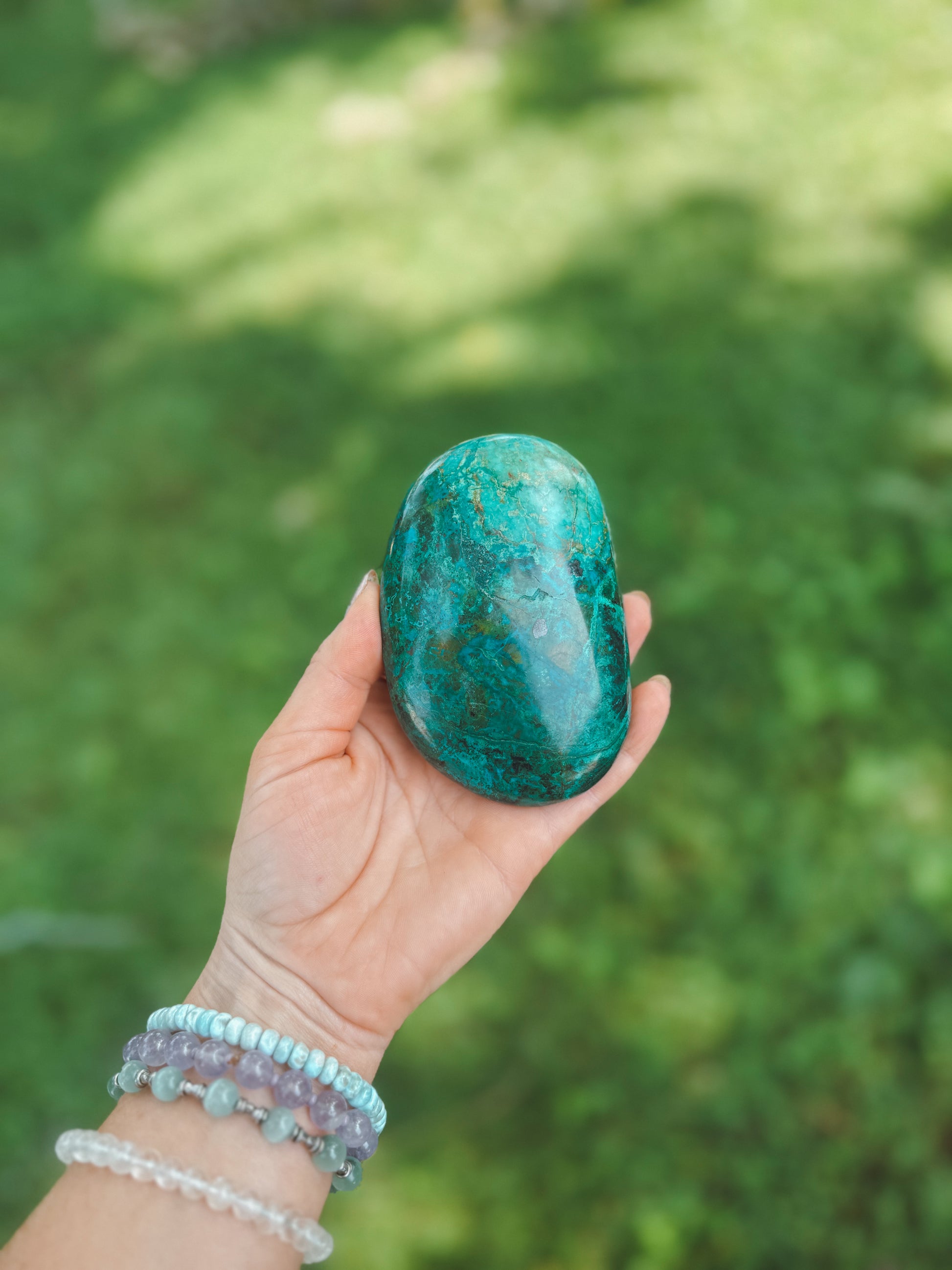 This listing is for one beautiful Chrysocolla palm stone, ethically sourced and hand-polished to fit perfectly in the palm of your hand. Larger than a tumbled stone, palm stones are powerful companions for meditation, healing, and daily intention-setting. Chrysocolla is treasured for its soothing energy, fostering clear communication, emotional balance, and divine feminine wisdom.