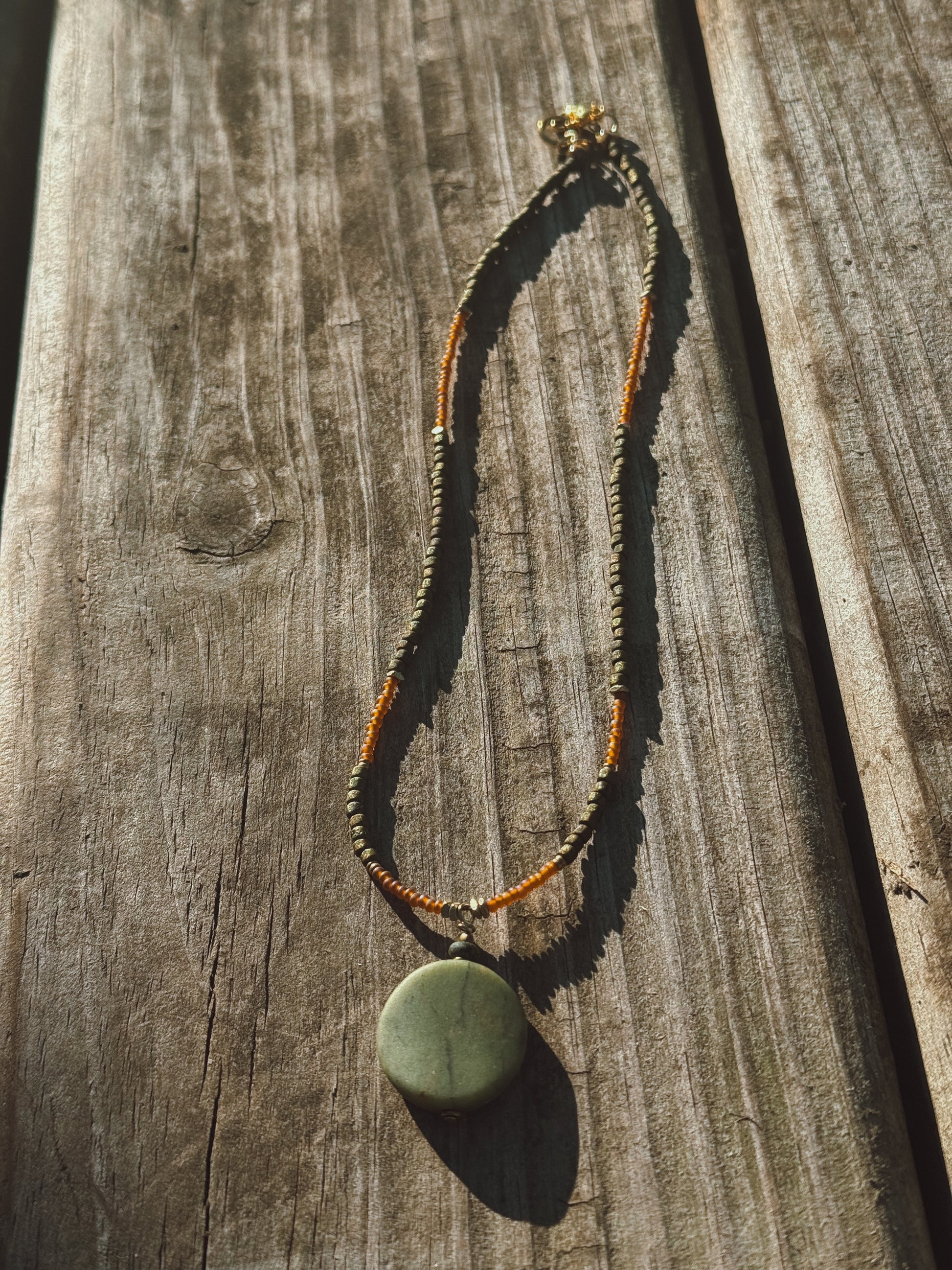 Our Green Jade Seed Bead Necklace is a one-of-a-kind piece, lovingly handcrafted by Crystal Lume. Featuring a smooth round Green Jade pendant suspended from an earthy strand of hand-strung seed beads in warm earthy tones, this necklace carries both subtle beauty and deep intention.